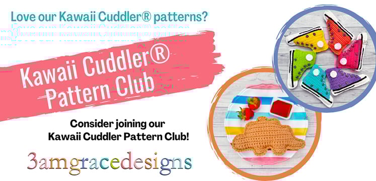 If you’ve never worked one of our Kawaii Cuddler® patterns, they are geared towards beginners. You will work two flat pieces and single crochet them together to finish the piece. Even if you’ve never been able to crochet from a pattern before, we’re confident you can create with a 3amgracedesigns pattern. We encourage you to join our Facebook Group where we remain active helping with questions! We love passing our love for the craft on to others!